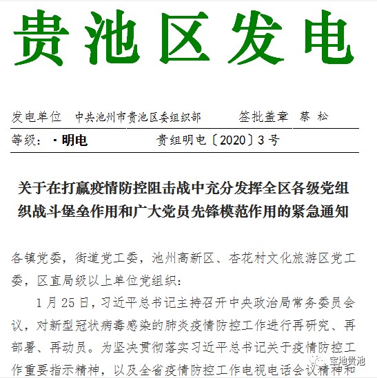 不期而至的新型冠状病毒感染的肺炎疫情,既是对党员干部的一次严峻考验,也是一场深刻的党性洗礼。面对疫情防控的严重形势,贵池区各级党组织和党员干部不忘初心、牢记使命,充分发挥战斗堡垒作用和先锋模范作用,让党旗在疫情防控第一线高高飘扬。