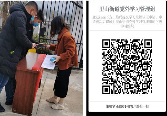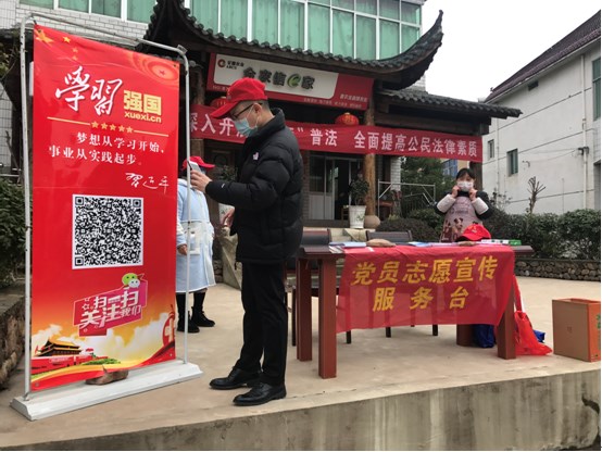 “大爷,您稍等,我给您扫一扫,下载个学习软件,保证您足不出户,什么法律、法规、国家大事都清楚了。您知道现在是特殊时期……”志愿者包祥翔忙上前去一边和老人家聊疫情防护知识,一边帮助他下载学习软件。