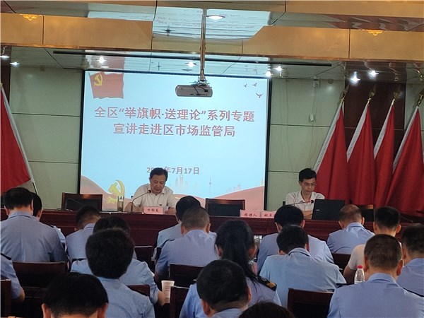7月17日上午,全区“举旗帜·送理论”系列专题宣讲走进区市场监管局,开展《中华人民共和国民法典》主题宣讲活动。局党组书记、局长方锡友主持宣讲会。局领导班子其他成员、机关全体人员、各机构和监管所负责人参加宣讲会。