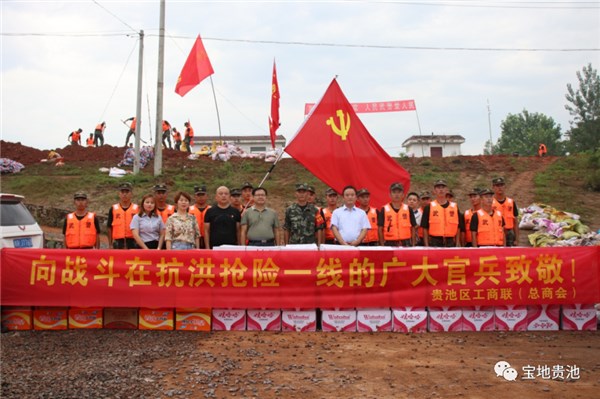 7月18日,区工商联组织会员企业专程前往涓桥镇普丰圩,看望慰问驻守防汛一线部队官兵,为他们送去矿泉水、方便面、棉袜等物资。