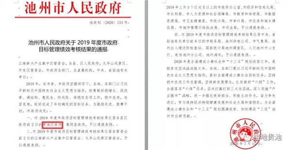 近日,池州市政府发布2019年度市政府目标管理绩效考核结果,贵池区在考核中位居各县区政府第一名,受到市政府通报表扬。