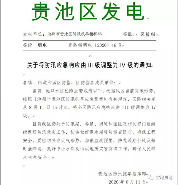 2020年8月11日15时,区防汛抗旱指挥部办公室宣布,贵池防汛应急响应等级由Ⅲ级调整至Ⅳ级。