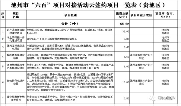 根据省委、省政府统一部署,池州市设分会场与省主会场视频连线。与会的市、县、区领导一同观看了主会场开幕式、主旨论坛、云展示启动仪式等直播活动。进入在线签约阶段后,我区共有7个重点项目成功实现“云签约”。其中矿产品廊道运输线建设项目在合肥主会场签约,该项目由中建材集团等投资35亿元,新建棠溪镇至乌沙矿产品运输通道,主线长40公里;还有水上物流链一体化建设、渔光互补光伏发电、铜板带基地建设、高速线材轧机生产基地建设、起帆特种电缆产业园、黄金旅游新专线开发等6个项目在池州分会场签约。此外,艾可蓝环保股份、力成机械装备、鸿叶集团三家企业参加了线上“云展示”。