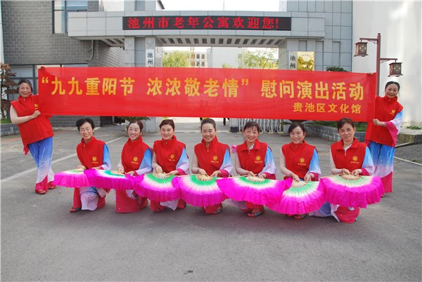 为传承中华美德,弘扬敬老文化,10月24日,由池州市社会体育指导员协会、池州老年大学和贵池区文化馆共同主办的"九九重阳节 浓浓敬老情"专场慰问演出在池州市老年公寓举行。上午九点半演出在大合唱《中国人民志愿军战歌》歌声中拉开序幕,之后文化志愿者们向老年公寓的离退休老人献上健身秧歌《秧歌扭出幸福来》和手拍鼓《美丽的草原我的家》,整场演出在激情澎湃的大合唱《没有共产党就没有新中国》的歌声中圆满结束!