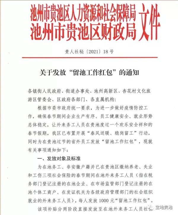 2月1日,贵池区人社局和区财政局联合印发《关于发放“留池工作红包”的通知》(以下简称《通知》),其中提到,为让外来务工人员在贵池度过一个欢乐安全祥和的春节假期,贵池区不仅布置开展“春风送暖、稳岗留工”行动,还将为在贵池过节的省外员工发放“留池工作红包”。