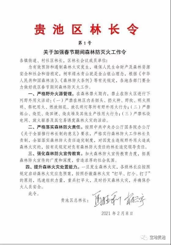 2月8日,区委书记、平天湖风景区党工委书记、区级总林长马胜利,区长、平天湖风景区管委会主任、区级总林长崩兴宇共同签发2021年第1号林长令——《关于加强春节期间森林防灭火工作令》,要求各级林长履职尽责,加强春节期间森林防灭火工作,确保人民生命财产及森林资源安全和社会和谐稳定。