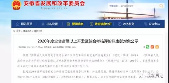 3月15日,安徽省发改委官方网站发布《2020年度全省省级以上开发区综合考核评价拟表彰对象公示》。公示中指出:根据《安徽省人民政府关于促进全省开发区改革和创新发展的实施意见》《安徽省人民政府办公厅关于修订印发省级以上开发区综合考核评价暂行办法的通知》,省发展改革委联合省统计局牵头各成员单位开展开发区综合考核评价工作。拟对2020年度考核居前30位的开发区报省政府予以表彰,并兑现奖励。