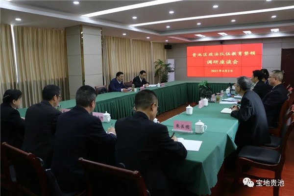 4月2日上午,区委书记、平天湖风景区党工委书记、区教育整顿领导小组组长马胜利到区法院执行局、杏花村法庭、区法院诉讼服务中心等地,专题调研督导区法院队伍教育整顿工作,并主持召开贵池区政法队伍教育整顿调研座谈会。他强调,要深入学习贯彻习近平总书记关于加强政法队伍建设的重要指示和训词精神,全面落实全国及全省全市政法队伍教育整顿部署要求,聚焦“筑根基、去沉疴、建机制、压责任”,推动政法队伍教育整顿走深走实,努力打造一支信念坚定、执法为民、敢于担当、清正廉洁的政法队伍,努力建设更高水平的“平安贵池”“法治贵池”。区委常委,政法委书记,区教育整顿领导小组副组长、办公室主任鲍胜利出席会议,区教育整顿办、区法院、区检察院、区司法局等有关单位负责人参加会议。