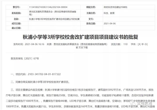 根据《批复》,项目建设地点全部在三个学校校园内,项目总投资为1750万元,其中省级以上财政资金1490万元,学校自筹260万元。具体为:秋浦小学计划资金1100万元,杏花村实验学校计划资金350万元,茅坦初级中学计划资金300万元。