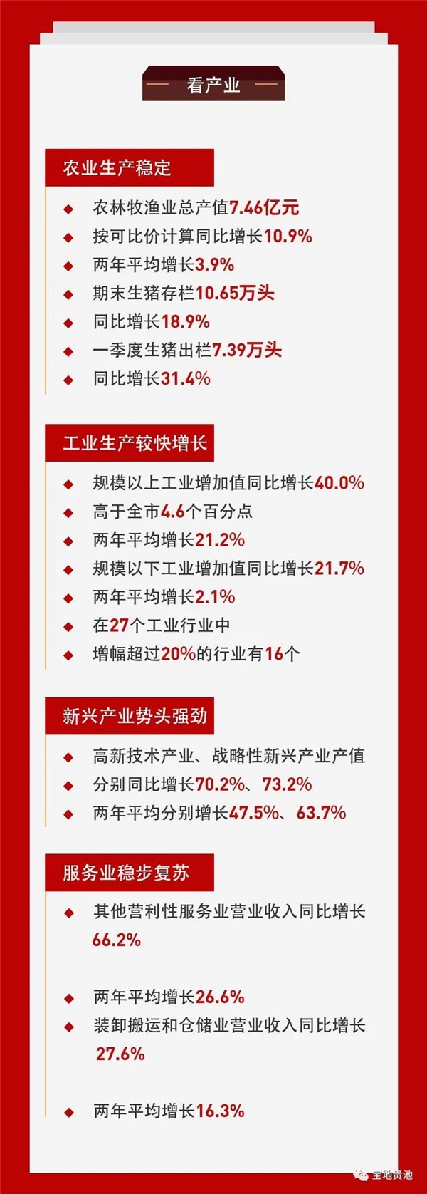 一季度,全区规模以上工业增加值同比增长40.0%,高于全市4.6个百分点,两年平均增长21.2%。规模以下工业增加值同比增长21.7%,两年平均增长2.1%。分经济类型看,一季度,国有控股企业增加值同比增长17.1%,股份制企业同比增长44.5%,外商及港澳台商投资企业同比增长52.0%;分三大门类看,规上采矿业增加值同比增长18.3%,规上制造业同比增长45.0%,规上电力、热力、燃气及水生产和供应业同比增长12.3%。在27个工业行业中,23个行业与上年同期相比保持正增长,其中增幅超过20%的行业有16个。规上工业企业实现营业收入同比增长67.6%,营业利润同比增长160.1%。同时,高新技术产业、战略性新兴产业实现产值同比增长70.2%、73.2%,两年平均分别增长47.5%、63.7%。