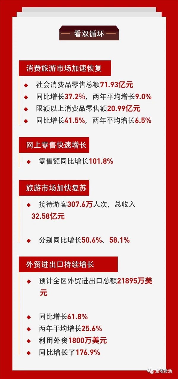 一季度,社会消费品零售总额71.93亿元,同比增长37.2%,两年平均增长9.0%,其中限额以上消费品零售额20.99亿元,同比增长41.5%,两年平均增长6.5%。同时,网上零售快速增长,零售额同比增长101.8%。旅游市场加快复苏,共接待游客307.6万人次,旅游总收入32.58亿元,分别同比增长50.6%、 58.1%。