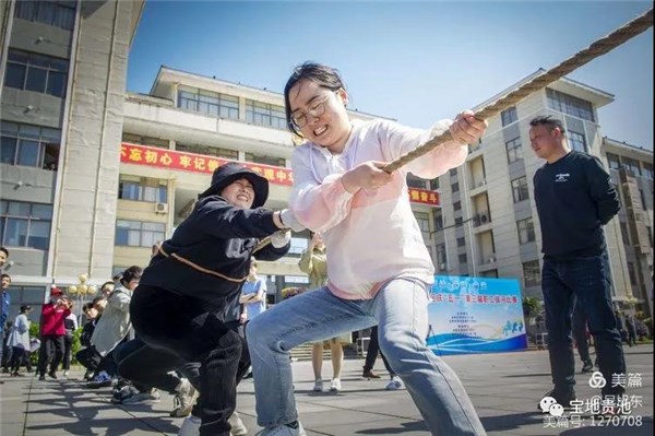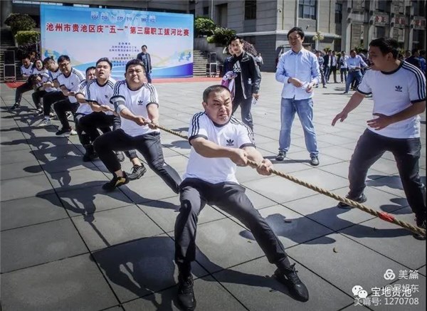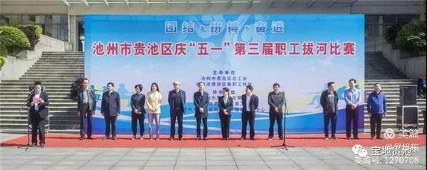 4月29日,由贵池区总工会、 贵池区教职工体育协会主办的庆“五·一”第三届职工拔河比赛在政务新区广场拉开帷幕,区委副书记徐洁芳,区委常委、常务副区长张勇,区人大常委会副主任、区总工会主席袁振兴,区政协副主席吴淞出席开幕式。
