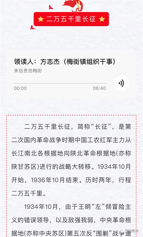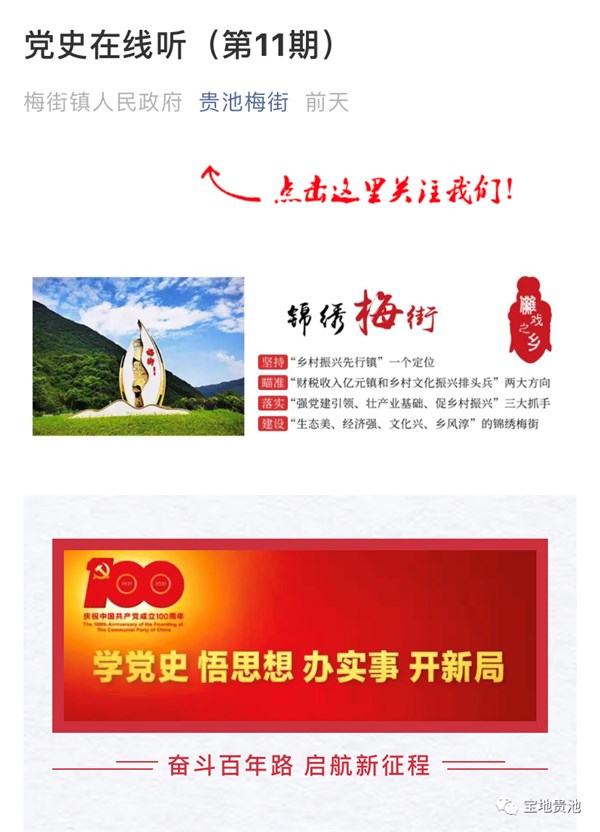 原来,“贵池梅街”公众号最近开设了一档“党史在线听”栏目,镇里的年轻党员都化身“主播”,利用闲暇时间,录制各类党史故事,方便群众收听。“我们的党史在线听栏目每周一、三、五推出,目前已推出19期党史故事。年轻党员在录制党史故事的过程中,不仅自己学习和重温了党史,也能通过宣传发布带动更多的人学党史,从而激励大家以信仰之光照亮前行之路。”梅街镇党委委员、宣统委员吴强告诉笔者。