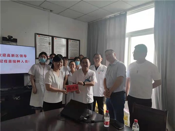 7月12日下午,池州高新区党工委委员、工会主席王蕾带领园区疫情防控专班工作人员到园区疫苗接种点慰问一线医务人员。