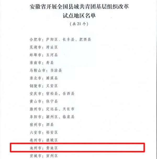 近日,经团中央书记处批准,我省合肥市庐阳区等21个区(县)入选全国县域共青团基层组织改革试点地区。