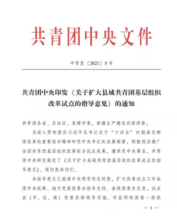 为积极稳妥推广全国共青团基层组织改革综合试点成果,今年5月,共青团中央研究制定了《关于扩大县域共青团基层组织改革试点的指导意见》。根据要求,深化县域共青团基层组织改革,以健全联系青年、服务大局的组织体系为着力点,以破除“机关化”作风和“行政化”依赖为主要任务,以共青团在县域强化政治功能、形成社会功能为基本目标,推动改革不断向基层延伸。