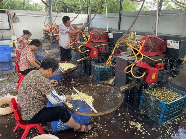 为进一步推进莲子种植的规模化、专业化、品牌化,观山村还建立起一条从种植、加工到销售的完整生态产业链,有效带动村民就业增收。走进牛头山镇观山村莲子加工厂,6台去壳机正在高速运作,工人们正在对莲子进行仔细挑拣,将外观形状合格的莲子放入烘烤机中,胡卫东告诉记者,莲蓬加工要经过去壳、清理、烘烤等八道工序,现在是加工厂最忙的时候,除了加工基地出产,同时还帮助村里其他莲农进行代加工,目前日加工量可达4000斤。
