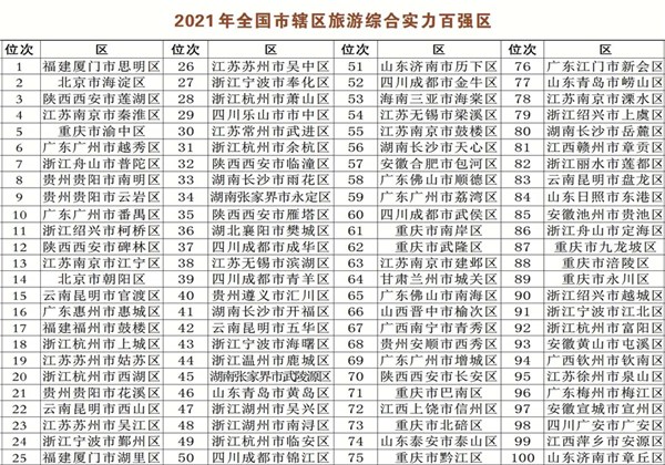 据悉,2021年全国市辖区旅游研究对象为中国大陆地区的973个市辖区,研究数据来源为各市辖区政府工作报告、统计公报、旅游公报等公开渠道数据和课题组调研所得数据。从旅游经济发展水平、政府推动作用、旅游产业综合带动功能、旅游开发与环境保护、旅游设施与服务功能、旅游质量监督与市场监管6个方面38个指标构建研究评价体系,得分居前100位的即为2021年全国市辖区旅游综合实力百强区。
