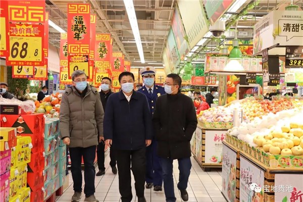 随后,马胜利来到毓秀门农贸市场、大润发超市、神画影院,检查市场疫情防控、保供应、保安全等工作。在毓秀门农贸市场,马胜利来到肉制品区、水产区等区域询问货品采购渠道及追溯措施,了解春节前夕市场货品价格变动、供销情况等。在大润发超市,马胜利详细了解了春节期间超市运营和生活必需品供应情况,并对超市消防安全工作进行了督导。在神画影院,马胜利十分关心人员密集场所的疫情防控和消防安全工作,要求影院要落实好主体责任,从严做好扫码测温、佩戴口罩、消毒消杀、消防安全防范等工作。