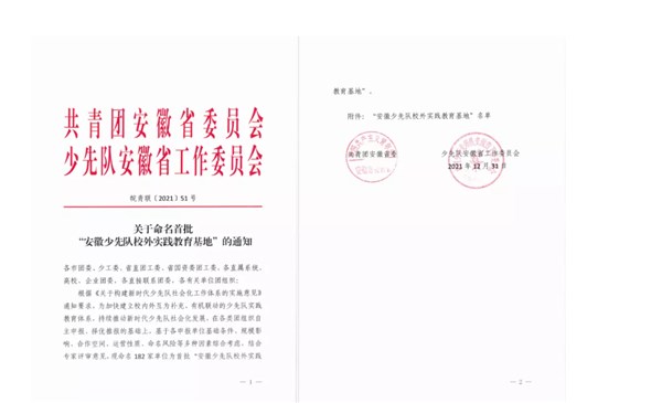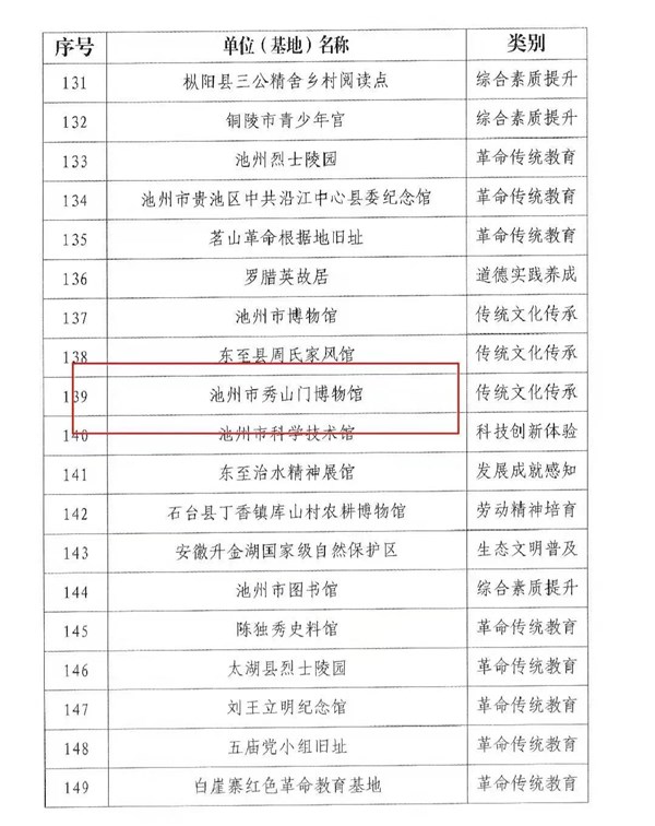 近日,共青团安徽省委员会、少先队安徽省工作委员会发布全省首批“安徽少先队校外实践教育基地”名单,池州市图书馆、池州市博物馆、池州市秀山门博物馆3家文旅系统单位入选省基地。