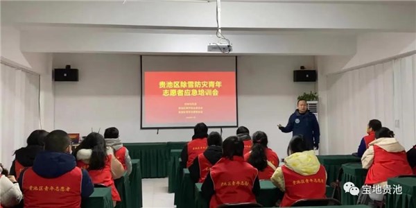 早在年前池州市气象局第一次发布气象灾害预警时,贵池共青团微信公众号便发出了《致全区各级团组织和广大团员青年除雪防灾倡议书》,号召广大团员青年在确保自身安全的前提下,积极响应,勇挑重担,积极走进社区及所在区域的主干道、人行道参与清雪除冰工作;同时,团区委还发布了一则防灾应急预备队招募令,成立了一支113人参与的“青年突击队”随时待命驰援一线。为提高队伍应急能力,团区委还在年前与区青年志愿者协会一同邀请了池州曙光公益救援队队员为他们开展除雪防灾青年志愿者应急培训会,从雪灾的危害、如何做好个人保暖防护以及在雨雪天气参与志愿服务活动时如何保护好自己等方面为志愿者们进行系统培训。