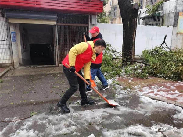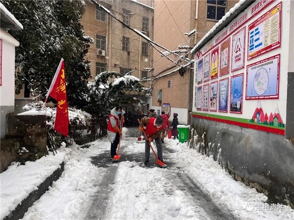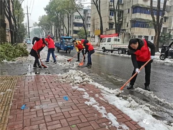 在池阳街道清风社区,社区党委组织的党员先锋队、辖区单位在职党员志愿者们等30余人也奋力挥锨舞帚,在居民小区主干道和人行道上进行了铲雪大行动。