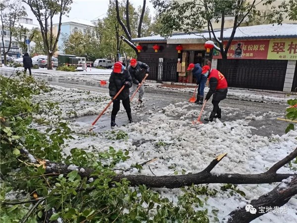寒风刮过,雪凝成了冰,冰又被过往的车辆和行人碾压得硬邦邦,每一铲挥下去都要花费很大力气。但火红的党员志愿者马甲点燃了大家的热情,融化着坚硬的冰雪,大家不顾严寒,并肩作战,风里雪里,一呼一喝,一锨又一铲,志愿者服上的党徽也似乎在跳跃着为大家加油鼓劲。居民们看到志愿者们火热的干劲,也被这雪白里的一抹红所感染,纷纷加入到铲雪队伍中。经过大家数小时的努力,黄梅、气象等几个小区主干道的积雪已清扫干净。大家一边扫着雪,一边提醒着过路的行人:“小心路滑,慢点走,注意安全”,遇到行动不便的居民便主动上前扶一下、拉一把。