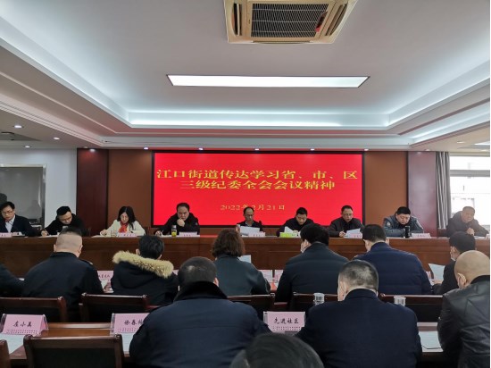 2月21日上午,江口街道召开专题会议,传达学习省市区纪委全会精神。街道全体干部职工,各社区书记及两委成员参加会议。