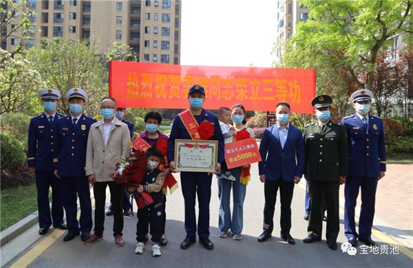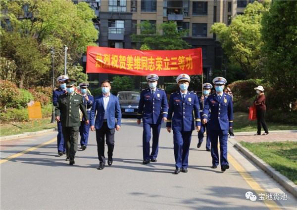 4月11日,区消防救援大队文员姜维的家门口格外热闹,池州市消防救援支队联合区人武部、区消防救援大队、区应急管理局、池阳街道等部门、街道组成的“报喜”队伍为姜维家送上了三等功立功奖章、证书及奖励金。这份荣誉,承载着姜维在区消防救援大队的成长与进步,折射着他为消防救援事业付出的辛勤汗水。