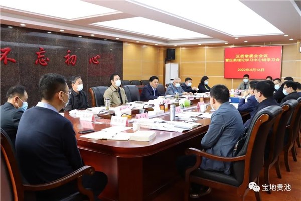 4月16日上午,市委常委、区委书记马胜利主持召开区委常委会会议暨区委理论学习中心组学习会,传达学习省辖市一季度工作点评会议精神及省委副书记、省长王清宪同志在池调研时的讲话精神并就贯彻落实有关精神作具体安排部署。区人大常委会主任吴波,区政协主席鲍胜利,区委副书记、梅龙街道党工委书记潘良能等区委理论学习中心组成员参加学习。