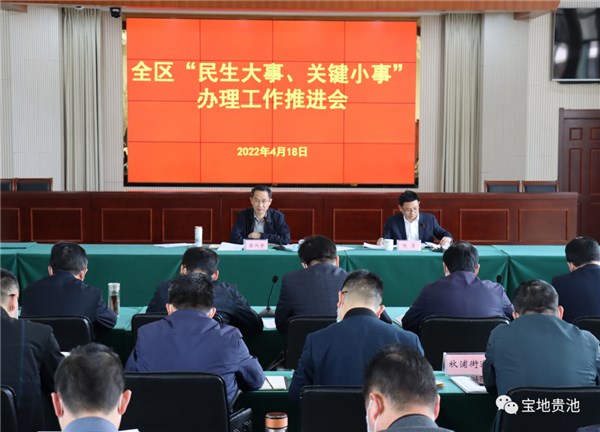 4月18日下午,我区召开“民生大事、关键小事”办理工作推进会,贯彻落实中央、省、市关于保障改善民生、实施民生实事工作的决策部署,总结全区2021年民生工程实施及考核情况,全面部署推进2022年全区“民生大事、关键小事”办理工作。区长崩兴宇出席会议并讲话,区委常委、常务副区长张勇主持会议。