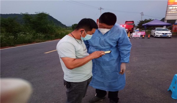 “师傅,您好,请出示健康码、行程码,同行的人员也请出示一下。”5月30日傍晚的九华山北高速卡口,江口街道办事处李泉江副主任正带领街道工作人员,穿着防护服对进入九华山北高速卡口的车辆人员进行信息登记填报、扫码测温、核酸检测等疫情防控工作。值守人员相互配合,有序进行,确保“不漏一车,不漏一人”。