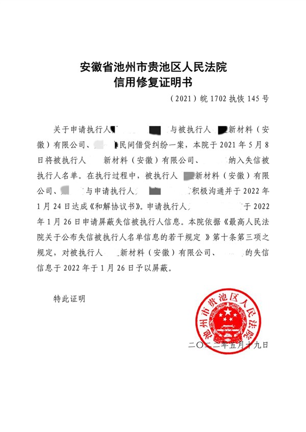 5月19日,该院执行法官再次接到该企业的电话。该企业法定代表人称该公司在申报“专精特新”和“科技型企业”的过程中,发现企业征信报告记录显示被列入“失信被执行人”。执行人员经查询发现,该案经和解后已依据申请人的申请将公司失信信息予以了屏蔽,但企业征信报告中仍显示“失信被执行人”,而申报项目资金时间紧张。该院经核实情况后,结合“江淮风暴”执行攻坚优化营商环境之夏季行动,立即为该企业出具了《信用修复证明书》,为该公司顺利完成申报工作扫除了障碍。