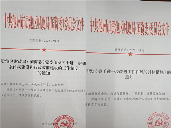 完善制度,夯实管理基础。结合工作实际,制定《关于进一步改进工作作风的具体措施》《关于进一步加强作风建设和行政效能建设的工作制度》,落实目标责任,分类整改到位,发现问题、解决问题、改进工作。制定《贵池区财政局机关干部职工目标绩效考核办法(试行)》,以季评分、年总评的方式实现考评量化、细化、规范化,引导广大干部职工想事、干事、成事,倡导干事创业的良好氛围,形成争先恐后的竞争态势。