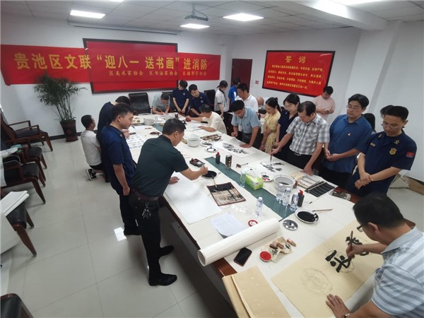 为庆祝建军95周年,7月20日,贵池区文联携手贵池区消防救援大队,组织区书协、区美协、区摄协二十名文艺志愿者、党员志愿者为消防救援队员们送来一场艺术盛宴。