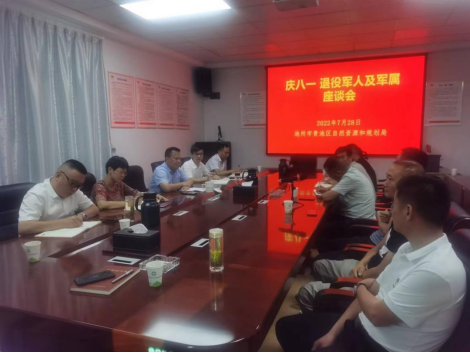 二是送温暖、话家常,焕发在岗建功立业的热情。7月28日下午,区自然资源和规划局召开退役军人及军属座谈会,局党组书记、局长刘志松出席会议并讲话,局机关7名退役军人和3名军属参加会议,刘志松代表局党组对退役军人和军属致以节日问候,对退役军人到区自然资源和规划局工作以来所取得的成绩给予充分肯定,引导退役军人离军不离党、退役不褪色,焕发永葆军人本色、建功立业新时代的热情和动力。