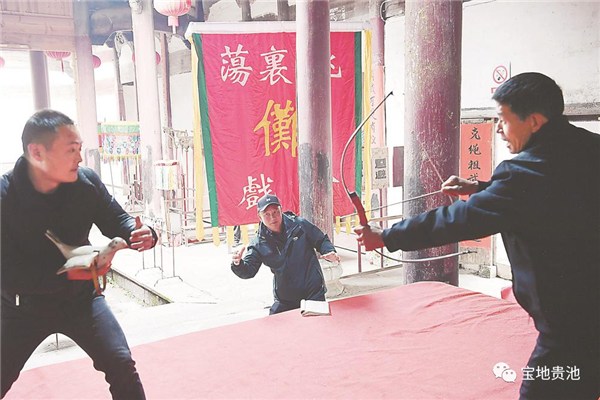 2月4日,在梅街镇姚街村荡里姚氏宗祠,国家级非遗传承人姚家伟(中)与村民排练次日将在青山庙会展演的傩舞《打赤鸟》。
