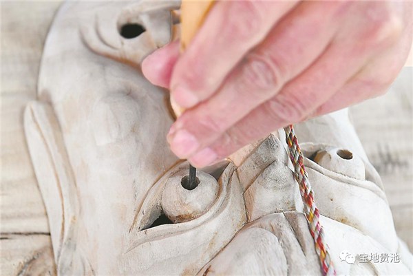 2月2日,在池州市梅街傩文化展示馆,池州傩面具雕刻技艺市级非遗传承人姚维耘在雕刻傩面具。