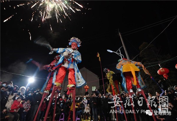 2月4日晚,在池州市贵池区墩上街道山湖村,高跷马傩戏表演吸引了众多观众。