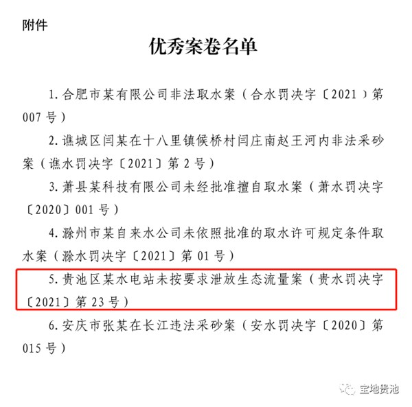 笔者从区水利局获悉,近日,安徽省水利厅组织的2020至2021年期间水行政执法案卷评查中,贵池区水利局报送的《贵池区某水电站未按要求泄放生态流量案卷》脱颖而出,喜获全省水行政执法优秀案卷,全省仅6份案卷获评优秀。