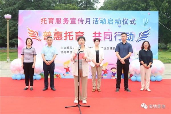 5月30日,贵池区托育服务宣传月活动启动仪式在主城区百荷公园广场举行。区委常委、区政府副区长汪赛荣出席活动并致辞,市卫健委有关负责人应邀参加并宣布活动启动。