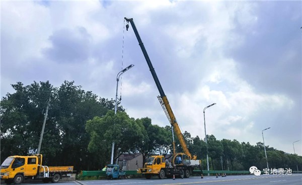 笔者在施工现场看到,工人们正在吊车的协助下有条不紊地作业,熟练地对路灯进行精准组装以及地面固定,相互配合十分默契,一架路灯十几分钟内便能安装完成。