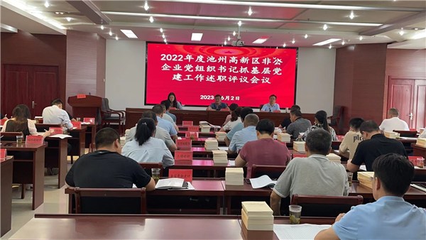 6月2日,池州高新区召开2022年度非公企业党组织书记抓基层党建工作述职评议会议。会议的主要任务是以习近平新时代中国特色社会主义思想为指导,深入贯彻党的二十大精神,全面贯彻落实市、区非公工委扩大会议部署要求,总结工作成绩,分析当前形势,部署重点任务。党工委委员、纪工委书记王卫东讲话,综合管理办公室副主任丁胜青主持会议。