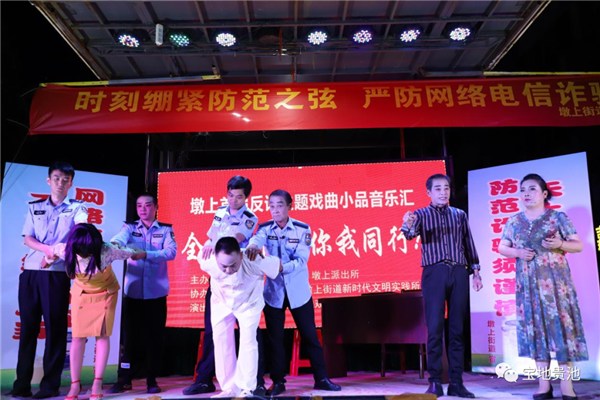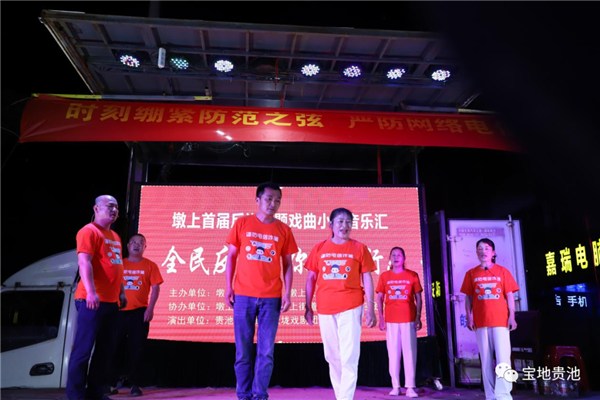 原来,当天池州市公安局贵池分局墩上派出所联合墩上反诈志愿者宣传联盟开展了“墩上首届反诈主题戏曲小品音乐汇”。这不,大伙们在各自村里的反诈宣传群里得知消息后,一吃完晚饭就早早赶到了现场,翘首以盼“大戏”开场。