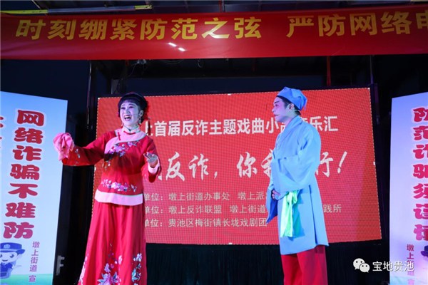 “中奖退税送便宜,全是骗子下得套。未知链接不可靠,存款信息保护好......”瞧,台上的音乐一响,台下的观众都不自觉地跟着哼起了旋律。作为罗城民歌之乡,墩上宣传反诈的方式也独具特色,由罗城民歌经典曲调改编歌词的“反诈民歌”更是深得现场观众的称赞,耳熟能详的曲调点燃了当地人的“民歌细胞”。“这个节目特别好!我们墩上人都能跟着唱两句,这下歌词记住了反诈知识也就记住了!”该街道河口村村民周震亚说。
