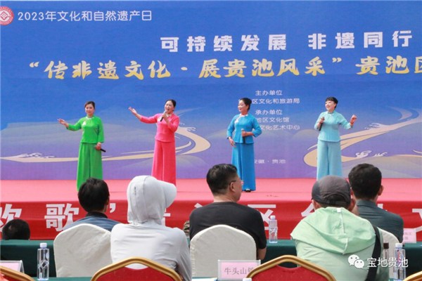 据了解,此次展演的直播平台统计观看人数达97022人次。6月10日是我国2023年“文化和自然遗产日”,非物质文化遗产既是历史发展的见证,也是珍贵的具有重要价值的文化资源,贵池非遗是凝聚着贵池历史文化深刻内涵的瑰宝。我区现有国家级非遗代表性项目“池州傩戏”;省级非遗代表性项目“贵池民歌”“梅街目连戏”“茅坦杜祭茅镰仪式”3项;市级非遗代表性项目“青山庙会”“水打秋浦县的传说”“乌石手狮舞”等8项;区级非遗代表性项目“乌沙小花生”“贵池龙灯”等16项。非遗项目代表性传承人70人。