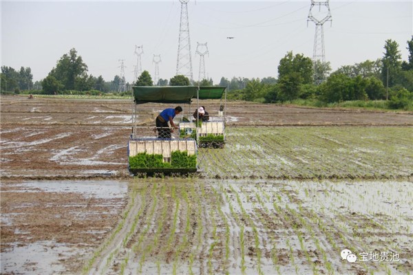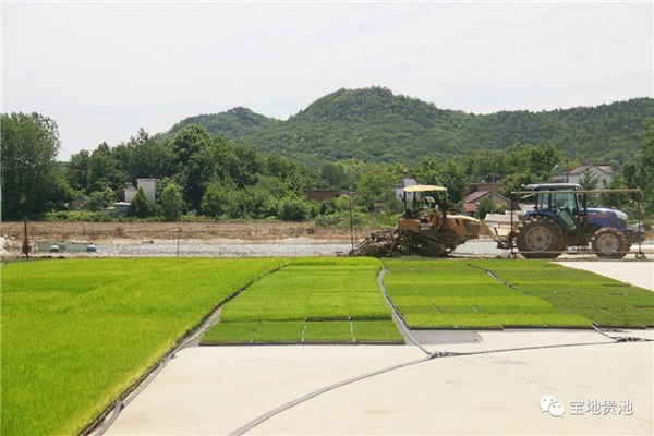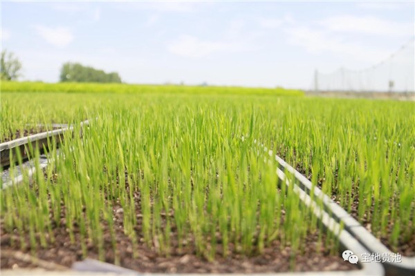 随后,笔者来到了池州市万兴家庭农村农场,这里是我区今年实施的七个集中育秧示范点之一。当天,田地里整齐摆放着生产期不一的育秧盘,插秧机上一片片整齐备插的秧苗正是来源于这里。