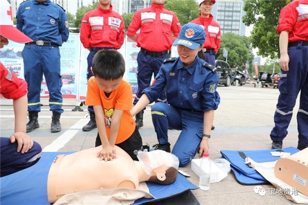 在随后开展的宣传活动中,来自市、区安委会各成员单位的工作人员分别通过摆放安全生产知识宣传展板、发放宣传资料、展示应急救援器材等形式向过往群众普及安全生产知识。同时,活动还特意设置了现场集中演示环节,来自消防、住建、交警、供电公司、港华燃气等部门和企业的工作人员,以及曙光公益救援队、蓝天救援队的队员分别上台演示了灭火器安全操作、安全帽和安全绳使用规范、道路交通标志和指挥手势、居民用电安全、燃气安全、无人机应急救援、心肺复苏、海姆立克急救法等安全生产和急救知识,并现场邀请观众参与互动。让大家身临其境学习安全生产知识,提升对安全生产工作的认知,形成“人人讲安全 个个会应急”的良好氛围。