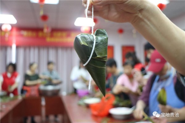 6月20日上午,池阳街道烟柳园社区很是热闹,还没走进活动室,便听见居民们你一言我一语地讨论声,楼道里飘满了粽叶和糯米交织在一起的清香。推开门一看,20余名居民正围在桌旁,灵巧的双手上下翻飞,转眼间一个个造型精巧的粽子争相“诞生”。