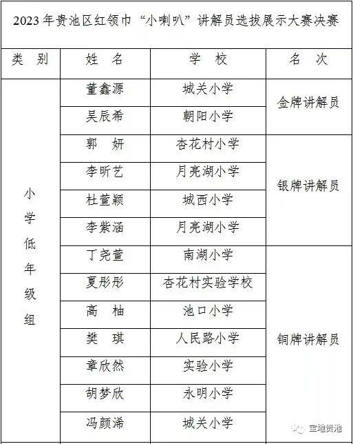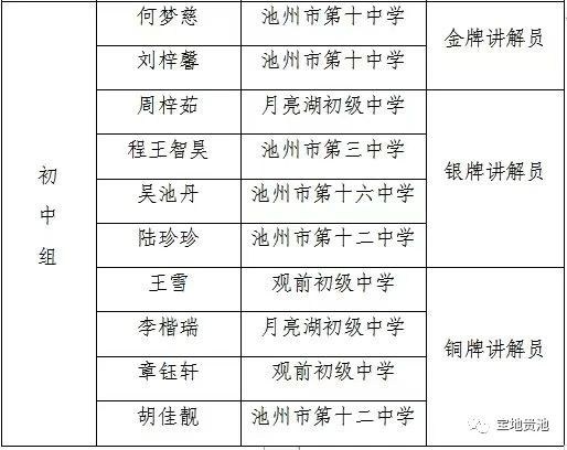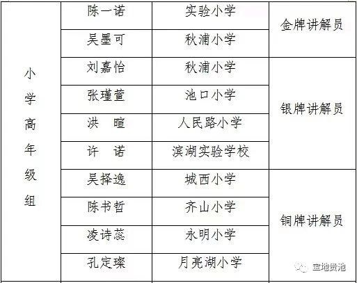 决赛分为小学低年级组、小学高年级组和初中组,经过一番激烈的角逐,评委们综合给分,根据评分结果选出金牌讲解员6名,银牌讲解员12名,铜牌讲解员15名。